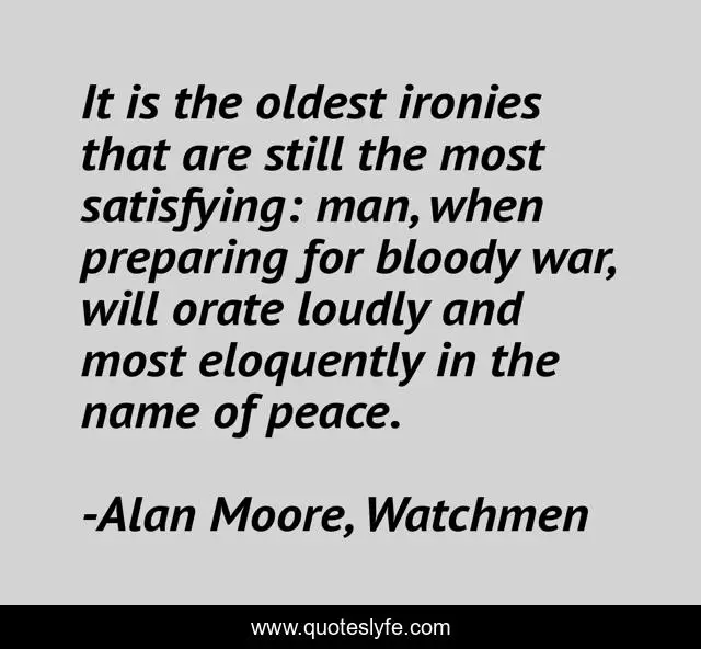 This page presents the quote "It is the oldest ironies that are still the most satisfying: man, when preparing for bloody war, will orate loudly and most eloquently in the name of peace.". Author of this quote is Alan Moore, Watchmen. This quote is about irony, peace, war,.