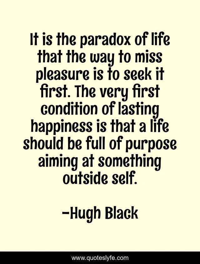 This page presents the quote "It is the paradox of life that the way to miss pleasure is to seek it first. The very first condition of lasting happiness is that a life should be full of purpose aiming at something outside self.". Author of this quote is Hugh Black. .
