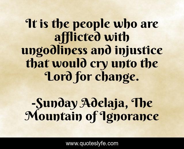 This page presents the quote "It is the people who are afflicted with ungodliness and injustice that would cry unto the Lord for change.". Author of this quote is Sunday Adelaja, The Mountain of Ignorance. This quote is about mountain, life, darkness, power, danger, light, people, ignorance, affliction,.