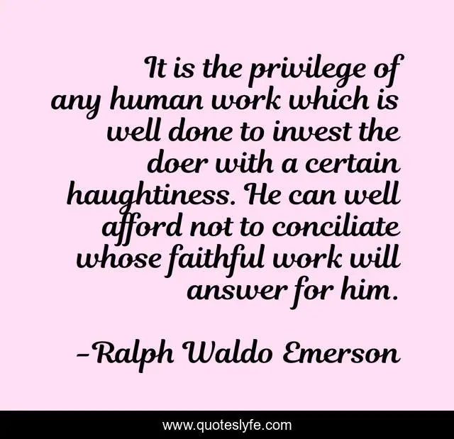 This page presents the quote "It is the privilege of any human work which is well done to invest the doer with a certain haughtiness. He can well afford not to conciliate whose faithful work will answer for him.". Author of this quote is Ralph Waldo Emerson. .