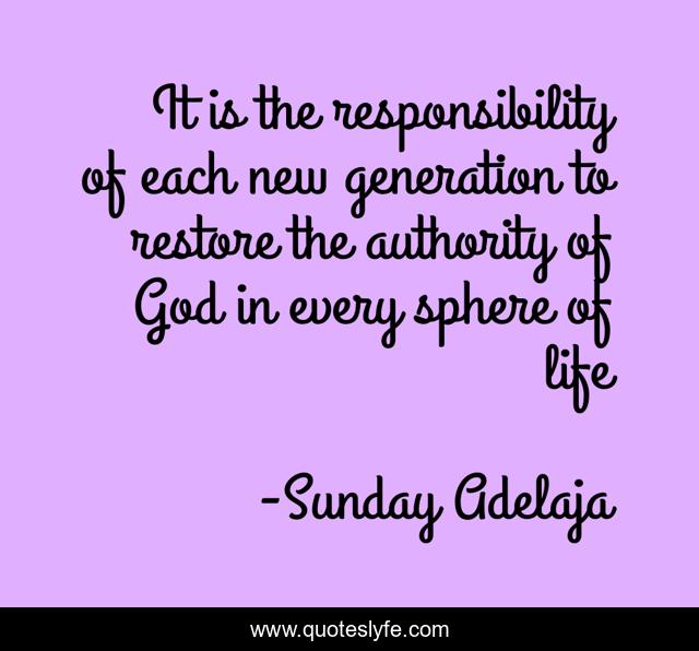 This page presents the quote "It is the responsibility of each new generation to restore the authority of God in every sphere of life". Author of this quote is Sunday Adelaja. This quote is about sphere, responsibility, each,.