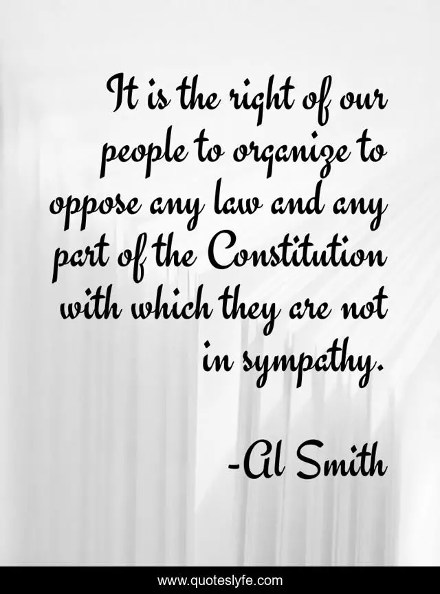 This page presents the quote "It is the right of our people to organize to oppose any law and any part of the Constitution with which they are not in sympathy.". Author of this quote is Al Smith. This quote is about law, constitution, people,.