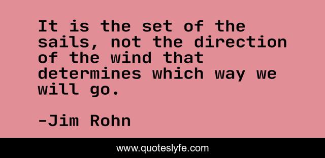 This page presents the quote "It is the set of the sails, not the direction of the wind that determines which way we will go.". Author of this quote is Jim Rohn. This quote is about direction, sails, wind,.