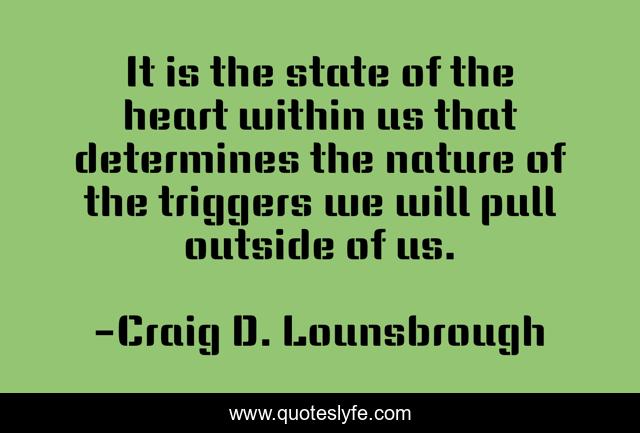 This page presents the quote "It is the state of the heart within us that determines the nature of the triggers we will pull outside of us.". Author of this quote is Craig D. Lounsbrough. This quote is about murder, triggers, gun-control, shootings, terrorism, carnage, massacres,.