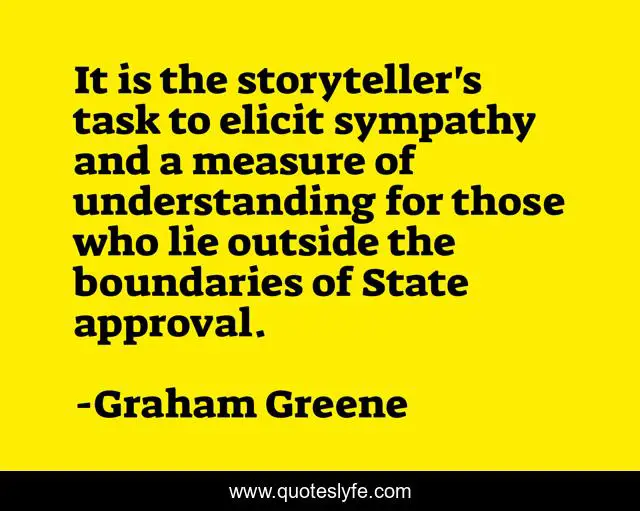 This page presents the quote "It is the storyteller's task to elicit sympathy and a measure of understanding for those who lie outside the boundaries of State approval.". Author of this quote is Graham Greene. This quote is about writing-philosophy, writing,.