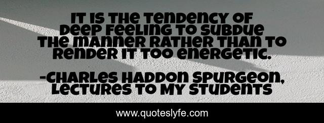 This page presents the quote "It is the tendency of deep feeling to subdue the manner rather than to render it too energetic.". Author of this quote is Charles Haddon Spurgeon, Lectures to My Students. This quote is about seriousness, discipleship, persuasion, leadership, sobriety,.