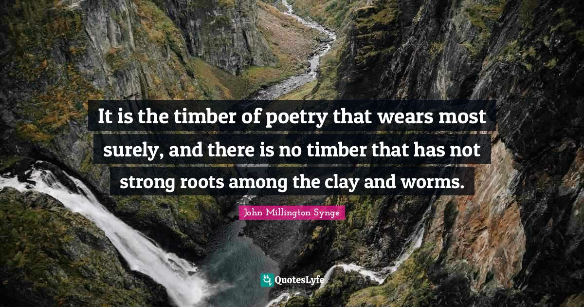 This page presents the quote "It is the timber of poetry that wears most surely, and there is no timber that has not strong roots among the clay and worms.". Author of this quote is John Millington Synge. This quote is about worms, poetry, clay, strong, timber, not strong, roots,.