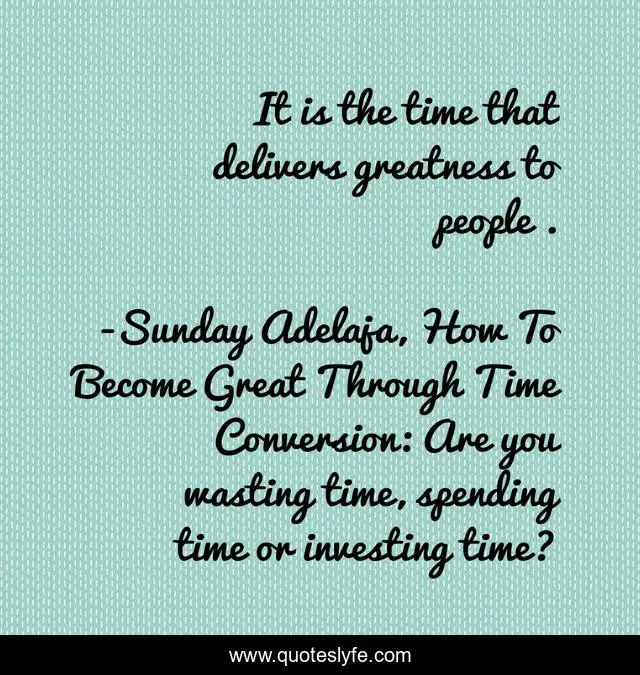 "Sunday Adelaja, How To Become Great Through Time Conversion: Are you wasting time, spending time or investing time? Quotes." Quoteslyfe.com, 2025. Sat. 06 Dec. 2025. <https://www.quoteslyfe.com/quote/It-is-the-time-that-delivers-greatness-39409>.