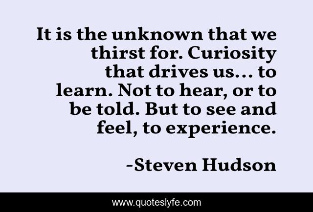 This page presents the quote "It is the unknown that we thirst for. Curiosity that drives us... to learn. Not to hear, or to be told. But to see and feel, to experience.". Author of this quote is Steven Hudson. This quote is about enthusiasm, life, inspirational, adventure, learning,.
