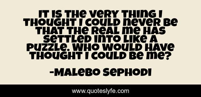 This page presents the quote "It is the very thing I thought I could never be that the real me has settled into like a puzzle. Who would have thought I could be me?". Author of this quote is Malebo Sephodi. This quote is about quotes-about-black-women, living-life, misbehaviour, missbehave,.