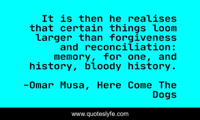 This page presents the quote "It is then he realises that certain things loom larger than forgiveness and reconciliation: memory, for one, and history, bloody history.". Author of this quote is Omar Musa, Here Come The Dogs. This quote is about reconciliation, history, forgiveness, memory,.