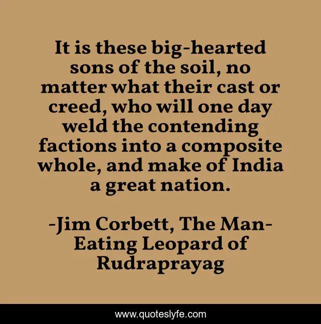 This page presents the quote "It is these big-hearted sons of the soil, no matter what their cast or creed, who will one day weld the contending factions into a composite whole, and make of India a great nation.". Author of this quote is Jim Corbett, The Man-Eating Leopard of Rudraprayag. This quote is about great, india,.