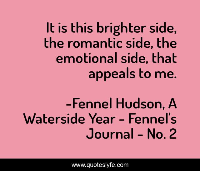 This page presents the quote "It is this brighter side, the romantic side, the emotional side, that appeals to me.". Author of this quote is Fennel Hudson, A Waterside Year - Fennel's Journal - No. 2. This quote is about motivation, purpose-of-life, happiness, life-purpose,.