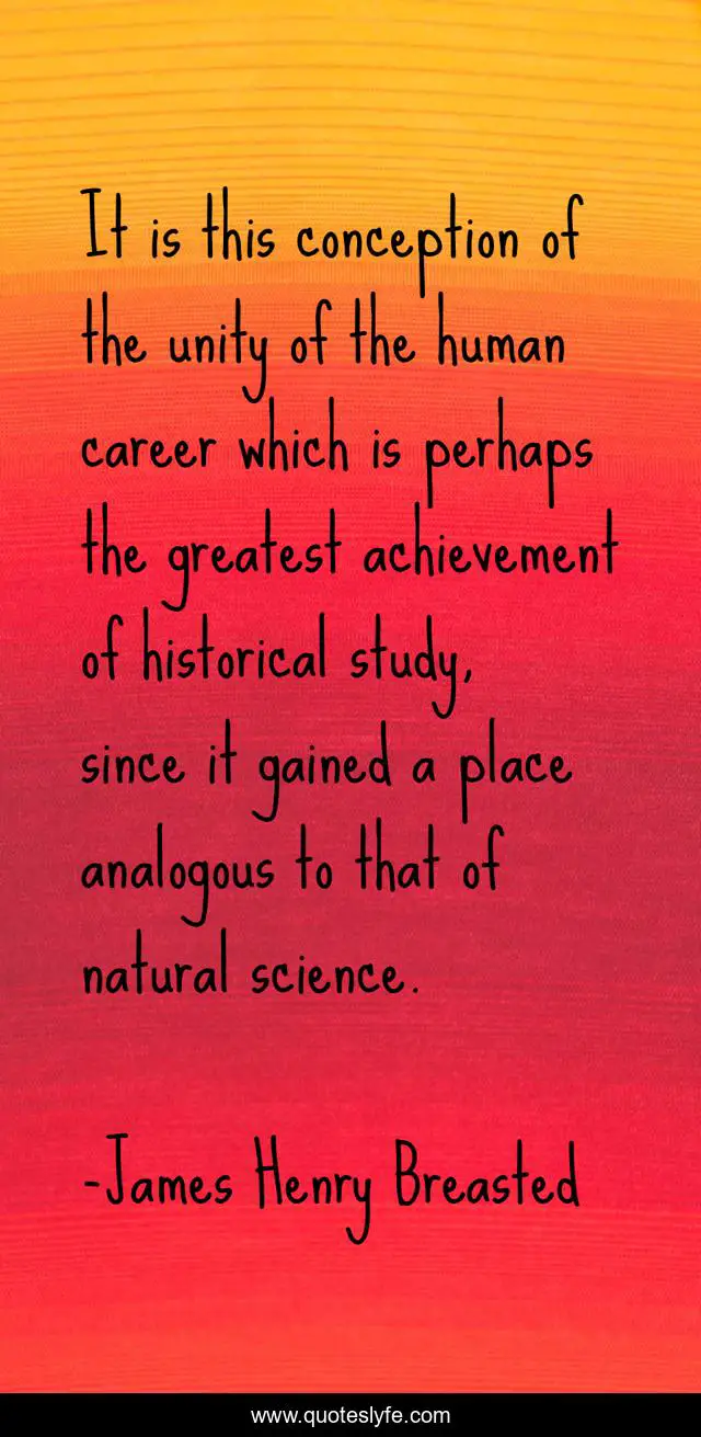 This page presents the quote "It is this conception of the unity of the human career which is perhaps the greatest achievement of historical study, since it gained a place analogous to that of natural science.". Author of this quote is James Henry Breasted. This quote is about unity, greatest, achievement,.