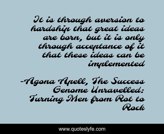 This page presents the quote "It is through aversion to hardship that great ideas are born, but it is only through acceptance of it that these ideas can be implemented". Author of this quote is Agona Apell, The Success Genome Unravelled: Turning Men from Rot to Rock. This quote is about success, management, ideas, leadership, quotes-about-life,.