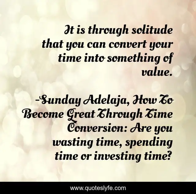 This page presents the quote "It is through solitude that you can convert your time into something of value.". Author of this quote is Sunday Adelaja, How To Become Great Through Time Conversion: Are you wasting time, spending time or investing time?. This quote is about solitude, life, conversion, productivity, wealth, greatness, waste, humanity, product,.