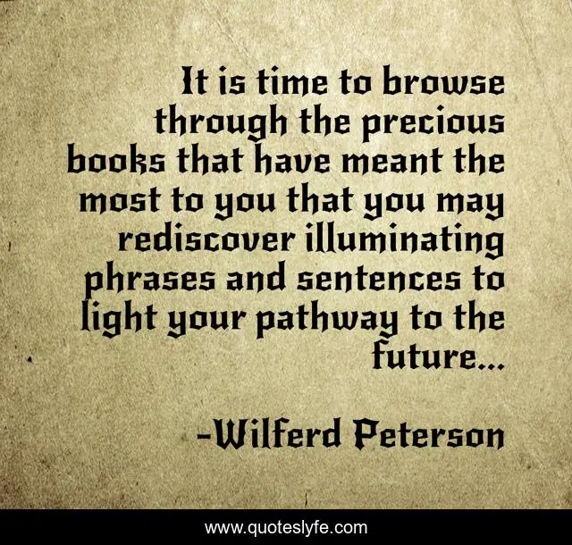 This page presents the quote "It is time to browse through the precious books that have meant the most to you that you may rediscover illuminating phrases and sentences to light your pathway to the future...". Author of this quote is Wilferd Peterson. This quote is about enthusiasm, books, inspirational,.