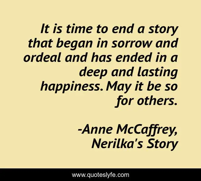 This page presents the quote "It is time to end a story that began in sorrow and ordeal and has ended in a deep and lasting happiness. May it be so for others.". Author of this quote is Anne McCaffrey, Nerilka's Story. This quote is about book-ending, sorrow, happiness,.