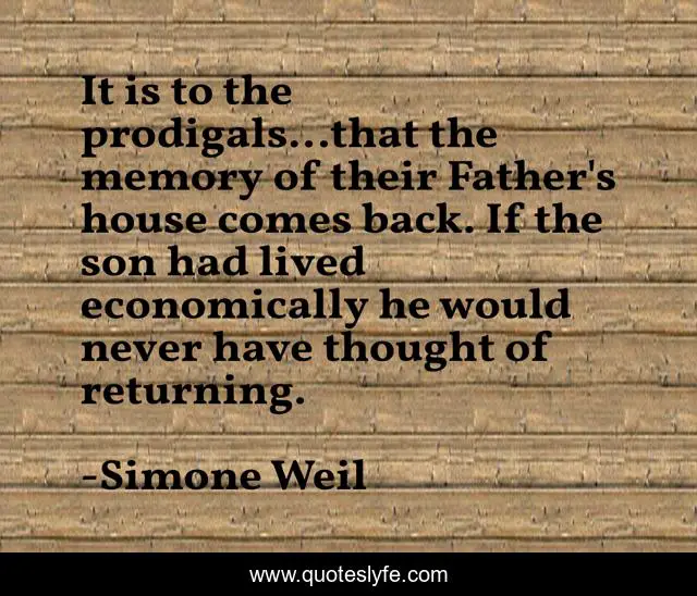 This page presents the quote "It is to the prodigals...that the memory of their Father's house comes back. If the son had lived economically he would never have thought of returning.". Author of this quote is Simone Weil. This quote is about home, son, return, prodigal, father,.