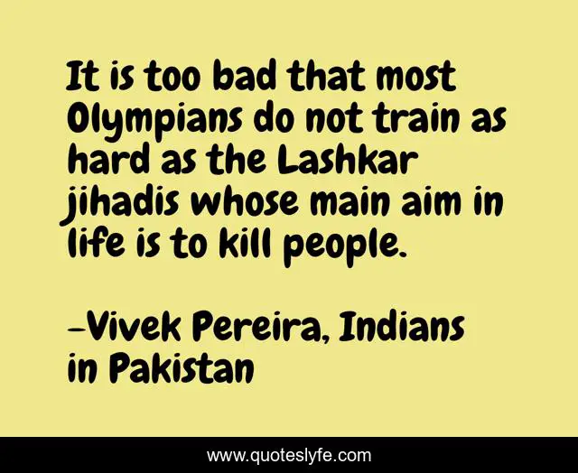 This page presents the quote "It is too bad that most Olympians do not train as hard as the Lashkar jihadis whose main aim in life is to kill people.". Author of this quote is Vivek Pereira, Indians in Pakistan. This quote is about lashkar, novel, jihadi, quotes, book, quotations,.