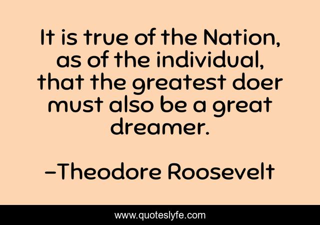 This page presents the quote "It is true of the Nation, as of the individual, that the greatest doer must also be a great dreamer.". Author of this quote is Theodore Roosevelt. .