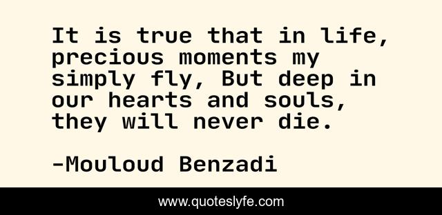 This page presents the quote "It is true that in life, precious moments my simply fly, But deep in our hearts and souls, they will never die.". Author of this quote is Mouloud Benzadi. This quote is about mouloud-benzadi, memories, love, affection, true-love,.