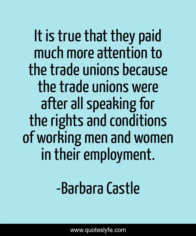 This page presents the quote "It is true that they paid much more attention to the trade unions because the trade unions were after all speaking for the rights and conditions of working men and women in their employment.". Author of this quote is Barbara Castle. This quote is about men, working, rights,.