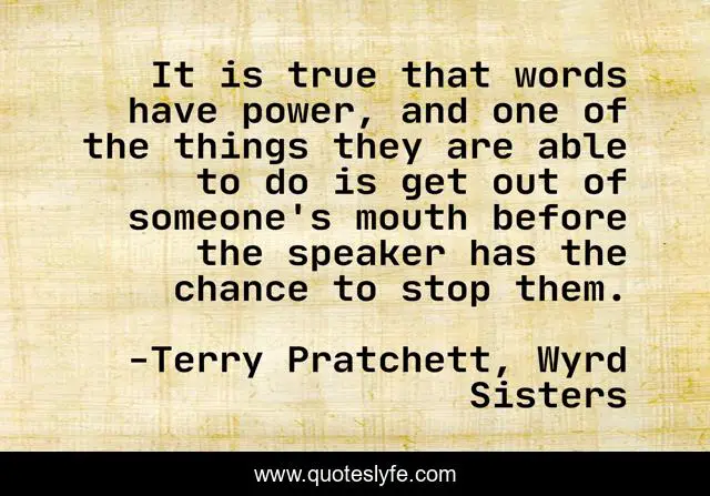 This page presents the quote "It is true that words have power, and one of the things they are able to do is get out of someone's mouth before the speaker has the chance to stop them.". Author of this quote is Terry Pratchett, Wyrd Sisters. This quote is about truth, power, pratchett, wyrd-sisters, words,.