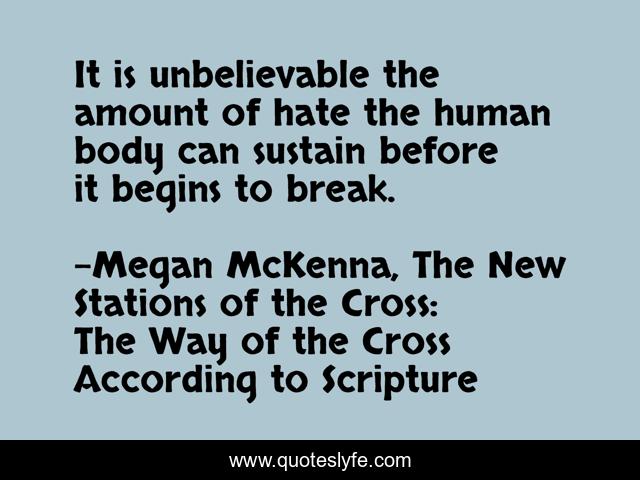 This page presents the quote "It is unbelievable the amount of hate the human body can sustain before it begins to break.". Author of this quote is Megan McKenna, The New Stations of the Cross: The Way of the Cross According to Scripture. This quote is about hate, bitterness,.