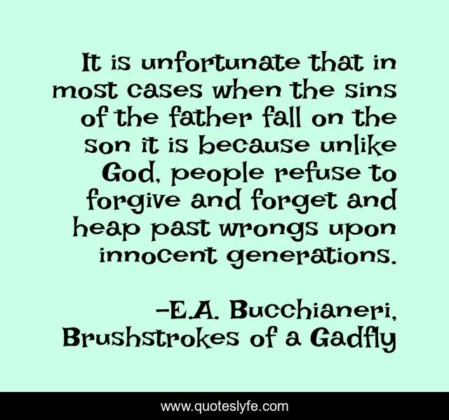 This page presents the quote "It is unfortunate that in most cases when the sins of the father fall on the son it is because unlike God, people refuse to forgive and forget and heap past wrongs upon innocent generations.". Author of this quote is E.A. Bucchianeri, Brushstrokes of a Gadfly. This quote is about gadfly, catholic-author, forgive-and-forget, catholic, sins-of-the-father, god, feuds, observations, innocent,.