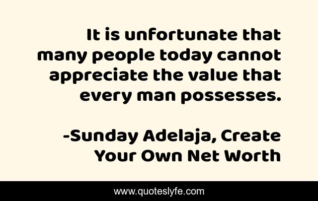This page presents the quote "It is unfortunate that many people today cannot appreciate the value that every man possesses.". Author of this quote is Sunday Adelaja, Create Your Own Net Worth. This quote is about possession, life, self-image, unfortunate-facts, people, god, nature, value, self-worth,.