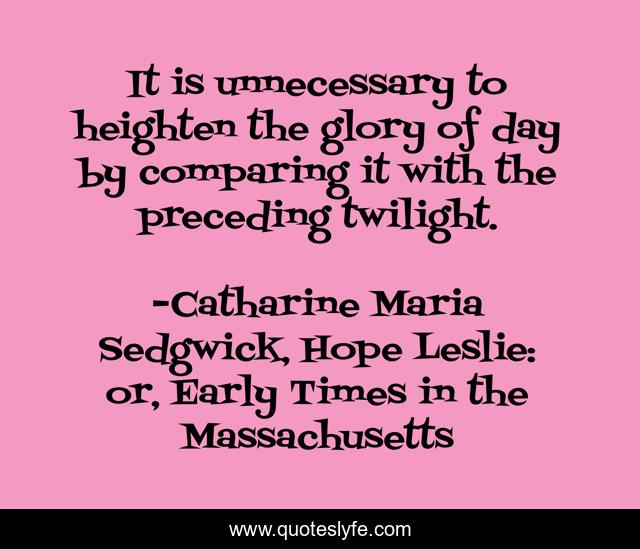 This page presents the quote "It is unnecessary to heighten the glory of day by comparing it with the preceding twilight.". Author of this quote is Catharine Maria Sedgwick, Hope Leslie: or, Early Times in the Massachusetts. This quote is about comparison, twilight, day, beauty, night,.