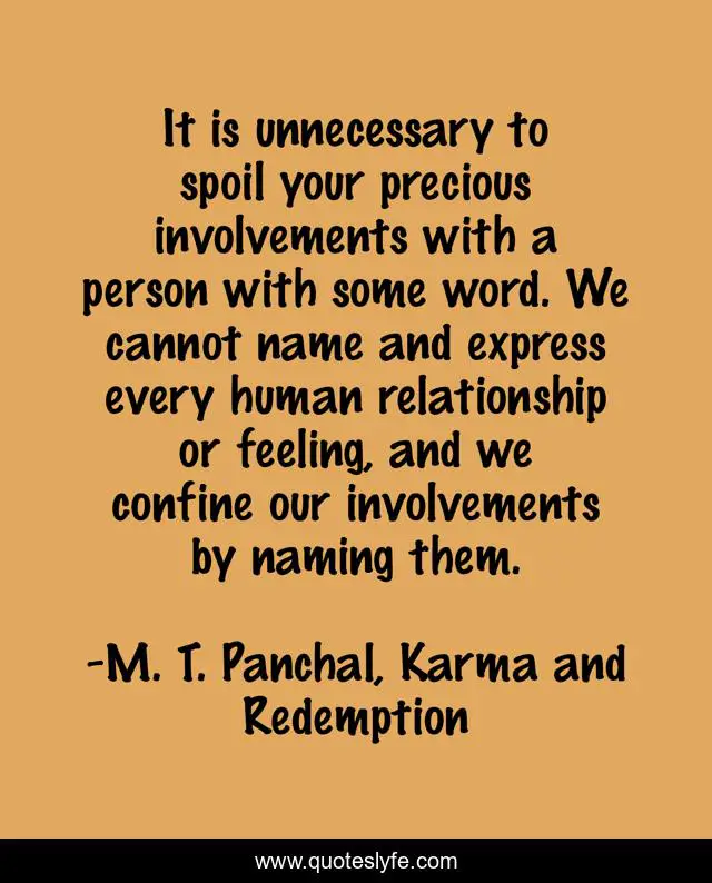 This page presents the quote "It is unnecessary to spoil your precious involvements with a person with some word. We cannot name and express every human relationship or feeling, and we confine our involvements by naming them.". Author of this quote is M. T. Panchal, Karma and Redemption. .