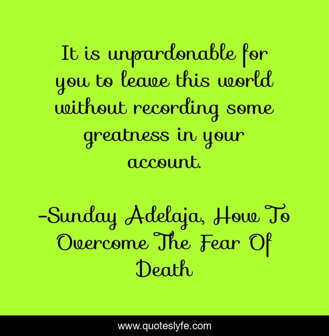 This page presents the quote "It is unpardonable for you to leave this world without recording some greatness in your account.". Author of this quote is Sunday Adelaja, How To Overcome The Fear Of Death. This quote is about humanity, great, productivity, wealth, gift, work, life, convert, value,.