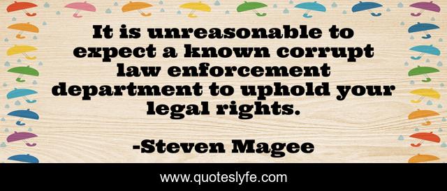 This page presents the quote "It is unreasonable to expect a known corrupt law enforcement department to uphold your legal rights.". Author of this quote is Steven Magee. This quote is about enforcement, uphold, rights, unreasonable, legal, department, expect, known, corrupt,.