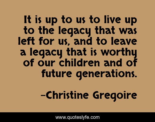 This page presents the quote "It is up to us to live up to the legacy that was left for us, and to leave a legacy that is worthy of our children and of future generations.". Author of this quote is Christine Gregoire. This quote is about live, legacy, children,.