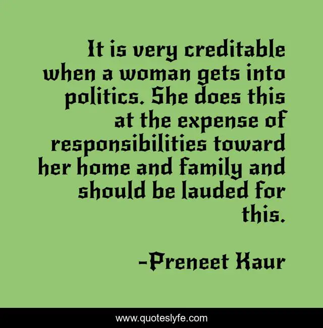 This page presents the quote "It is very creditable when a woman gets into politics. She does this at the expense of responsibilities toward her home and family and should be lauded for this.". Author of this quote is Preneet Kaur. This quote is about home, woman, family,.