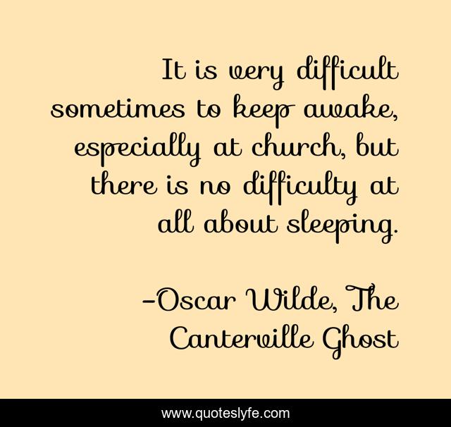 This page presents the quote "It is very difficult sometimes to keep awake, especially at church, but there is no difficulty at all about sleeping.". Author of this quote is Oscar Wilde, The Canterville Ghost. This quote is about sleep, church,.