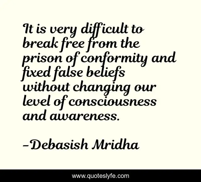 This page presents the quote "It is very difficult to break free from the prison of conformity and fixed false beliefs without changing our level of consciousness and awareness.". Author of this quote is Debasish Mridha. This quote is about consciousness, philosophy, debasish-mridha, false-beliefs, quotes, inspirational, enthusiasm, conformity, debasish-mridha-m-d,.