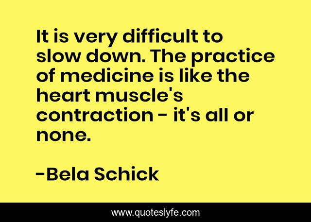 This page presents the quote "It is very difficult to slow down. The practice of medicine is like the heart muscle's contraction - it's all or none.". Author of this quote is Bela Schick. This quote is about medicine, sickness,.