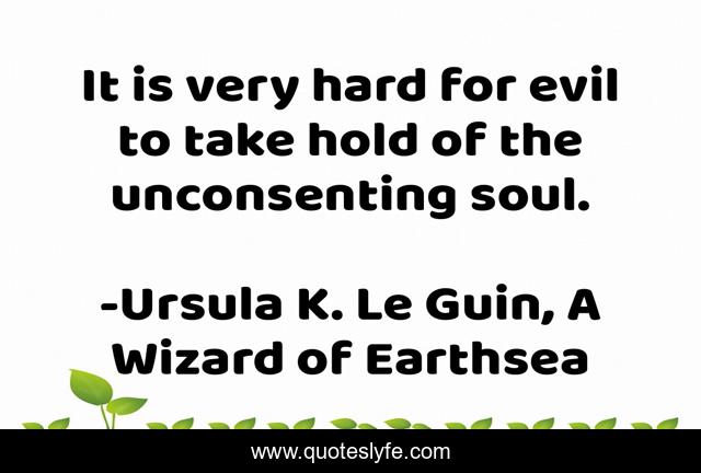 This page presents the quote "It is very hard for evil to take hold of the unconsenting soul.". Author of this quote is Ursula K. Le Guin, A Wizard of Earthsea. This quote is about soul, evil, ged,.