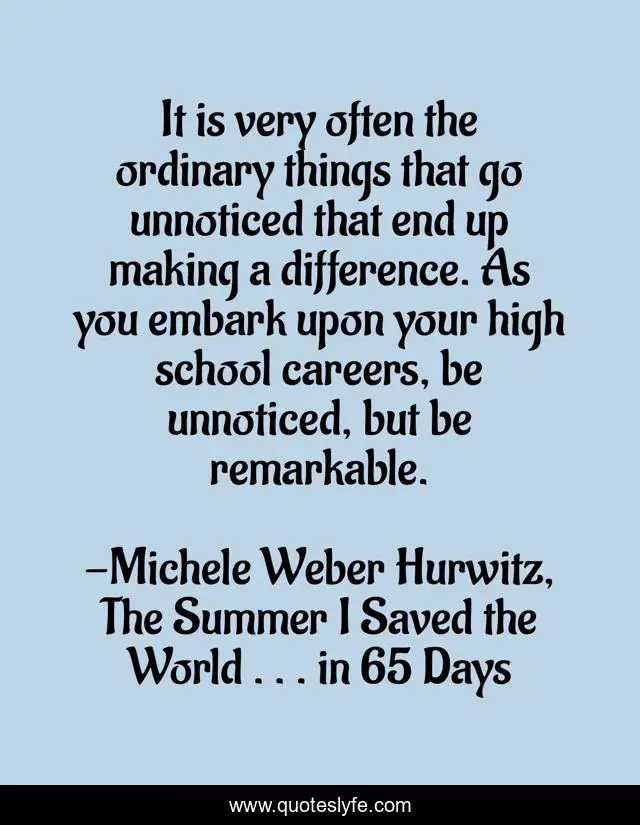This page presents the quote "It is very often the ordinary things that go unnoticed that end up making a difference. As you embark upon your high school careers, be unnoticed, but be remarkable.". Author of this quote is Michele Weber Hurwitz, The Summer I Saved the World . . . in 65 Days. This quote is about enthusiasm, coming-of-age, inspirational,.