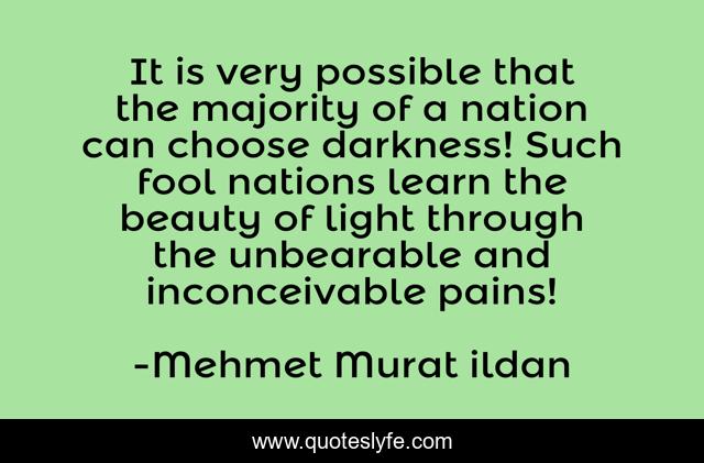 This page presents the quote "It is very possible that the majority of a nation can choose darkness! Such fool nations learn the beauty of light through the unbearable and inconceivable pains!". Author of this quote is Mehmet Murat ildan. This quote is about fool, turkish-aphorisms, ildan-words, darkness, ildan-wise-sayings, turkish, ildan-wisdom, light, beauty-of-light,.