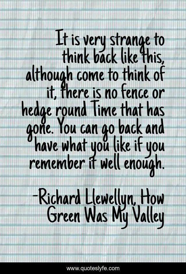 This page presents the quote "It is very strange to think back like this, although come to think of it, there is no fence or hedge round Time that has gone. You can go back and have what you like if you remember it well enough.". Author of this quote is Richard Llewellyn, How Green Was My Valley. This quote is about remembering, memories, memoryes, remember, time,.