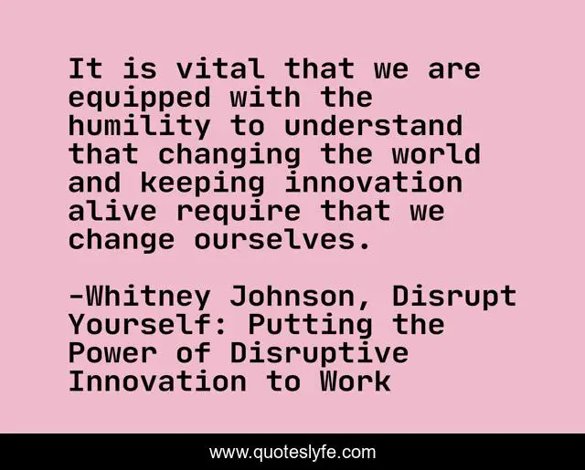 This page presents the quote "It is vital that we are equipped with the humility to understand that changing the world and keeping innovation alive require that we change ourselves.". Author of this quote is Whitney Johnson, Disrupt Yourself: Putting the Power of Disruptive Innovation to Work. This quote is about changing-the-world, humility, personal-change, innovation,.