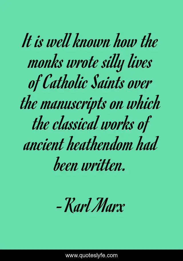 This page presents the quote "It is well known how the monks wrote silly lives of Catholic Saints over the manuscripts on which the classical works of ancient heathendom had been written.". Author of this quote is Karl Marx. This quote is about catholic, catholic-saints, ancient-greece, heathendom, saints, monks, destruction, classics, manuscripts,.