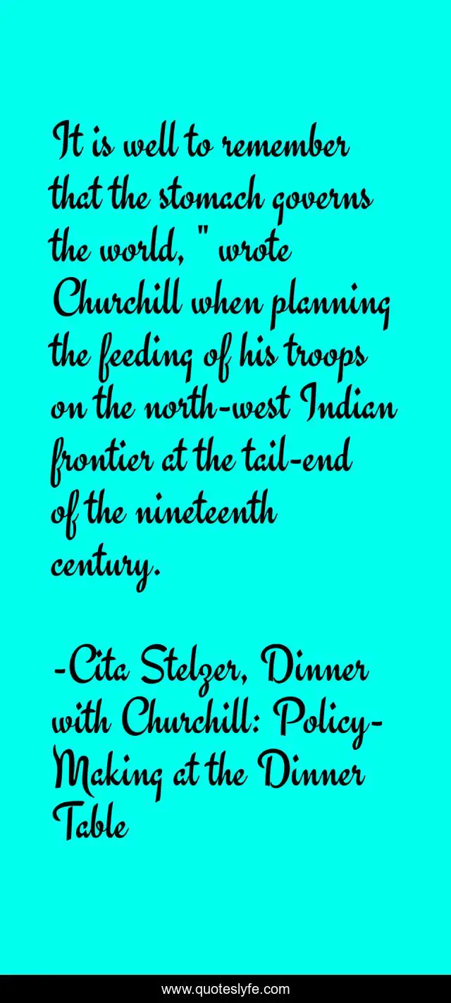 This page presents the quote "It is well to remember that the stomach governs the world, " wrote Churchill when planning the feeding of his troops on the north-west Indian frontier at the tail-end of the nineteenth century.". Author of this quote is Cita Stelzer, Dinner with Churchill: Policy-Making at the Dinner Table. This quote is about food, world-war-ii, churchill,.