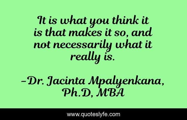 This page presents the quote "It is what you think it is that makes it so, and not necessarily what it really is.". Author of this quote is Dr. Jacinta Mpalyenkana, Ph.D, MBA. This quote is about thinking, mind-power, thinking-with-a-great-mind, thoughts,.