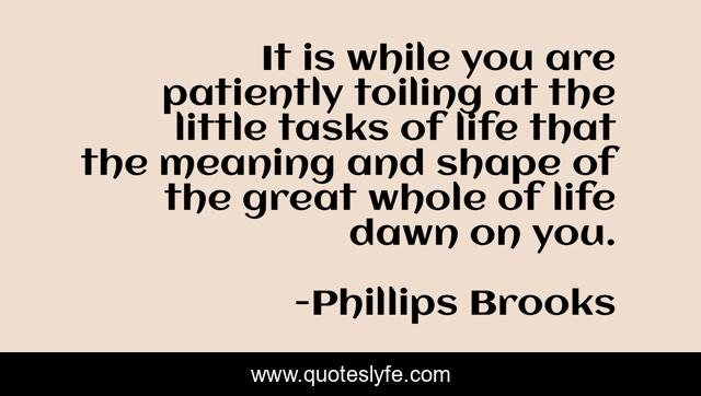This page presents the quote "It is while you are patiently toiling at the little tasks of life that the meaning and shape of the great whole of life dawn on you.". Author of this quote is Phillips Brooks. This quote is about great, meaning, life,.