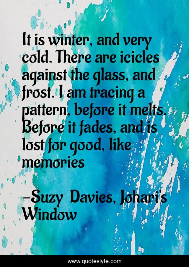 This page presents the quote "It is winter, and very cold. There are icicles against the glass, and frost. I am tracing a pattern, before it melts. Before it fades, and is lost for good, like memories". Author of this quote is Suzy Davies, Johari's Window. This quote is about romance, memoir,.